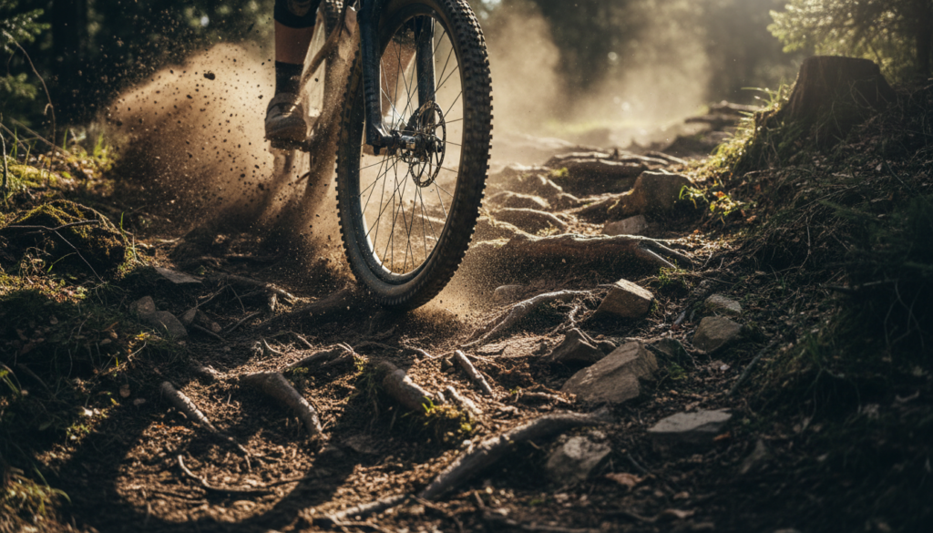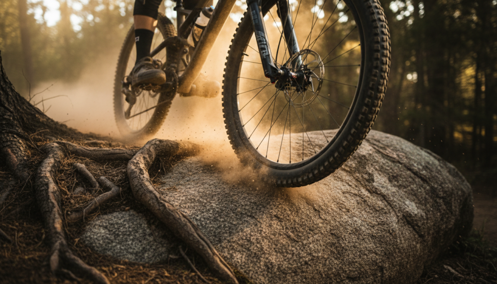Na aro 26 , o ângulo em que o pneu atinge essa raiz é agudo. A roda “bate” no obstáculo, gerando um vetor de força para trás. Resultado? Você perde o embalo, sente o soco sem orientação e precisa de uma explosão de força para subir.